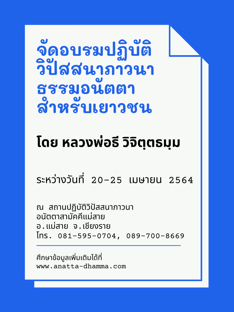 เนื่องจากสถานการณ์โควิดที่รุนแรงขึ้น จึงขอยกเลิกการจัดอบรมวิปัสสนาภาวนาธรรมอนัตตาดังกล่าว